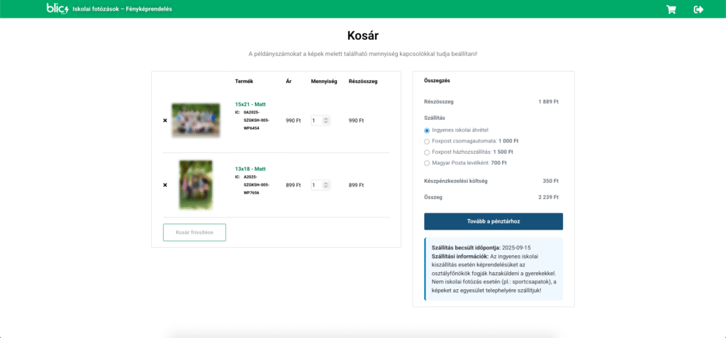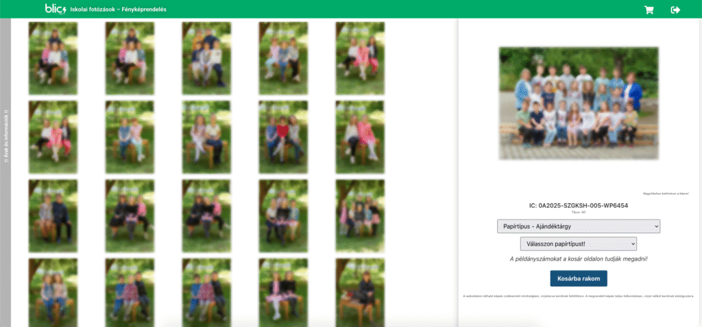 A válogatás során a képernyő bal oldalán látja a teljes galériát, a jobb oldalon az aktuálisan kiválasztott képet. A kiválasztott kép esetében, lehetősége van kiválasztani, milyen terméket szeretne kosárba helyezni, majd a Kosárba rakom gombra kattintva tudja hozzáadni a megrendelendő tételek közé.