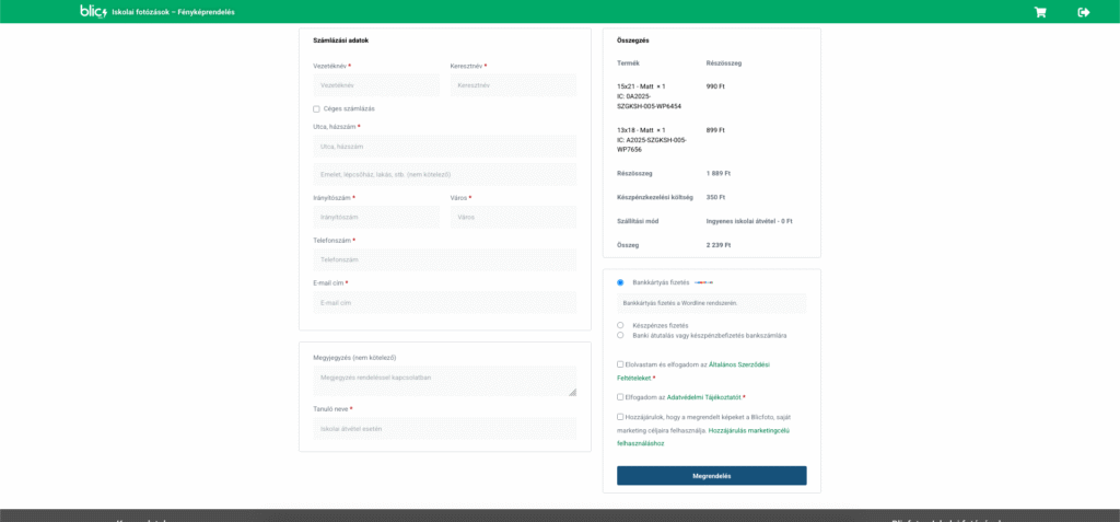 Miután megadta a bankkártya adatait, a lent található fizetés gombra kattintva tudja a fizetést elindítani, valamint rendelését rögzíteni.